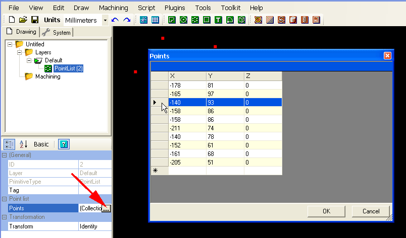 The points in a point list can also be edited in a tabular format by clicking the […] button to the right