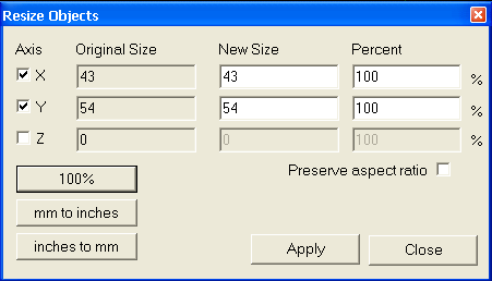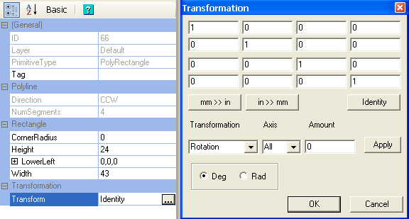 Changing the Transform property does not initially change any other object properties. For example, a circle center point and diameter, or polyline control points will remain unchanged. The transformed values will be automatically calculated when needed (during toolpath generation for example). To change these properties immediately, select an object then use the View - Apply Transformations menu option. This will transform all the shape’s properties where appropriate and then reset the transform matrix back to Identity.