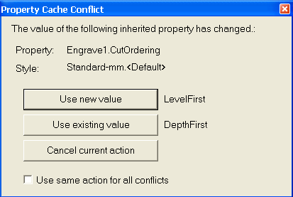If Use same action for all conflicts is checked, the same response will be used whenever a new conflict is detected. This remains in effect until the file is closed. The next time the file is opened, changed default properties will once again be reported.