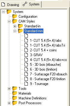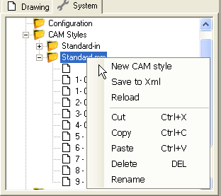 It is also possible to copy settings from machining operations into a style by copying the machining operation to the clipboard, selecting the system tab, right clicking a destination CAM style then selecting Paste format from the context menu. This provides a similar functionality to the Copy MOP to Template operation of previous CamBam versions.