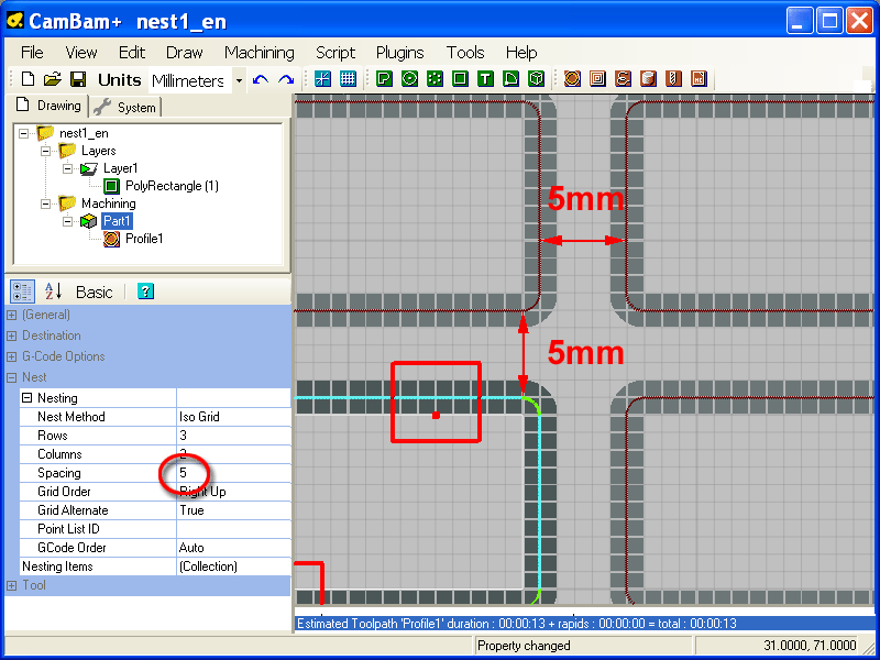 CamBam’s nesting provides a method to repeat a series of machining operations at different positions on the machine table. In this way, it is possible to produce multiple copies of a workpiece from a single drawing and one set of machining operations.