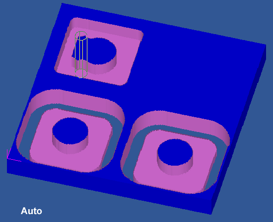 In the following example, the machining “Pocket1” (an island) and the cutting “Profile1” are machined with the same tool of 8mm diameter, the operation “Drill1” is performed with a tool of 2mm diameter, so there is a tool change at the beginning of the “Drill1” operation.