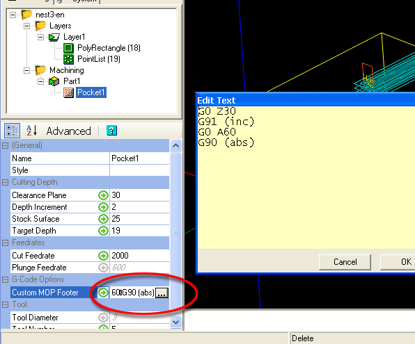 The machining operations in the Part will then be repeated at the same place. Add a Gcode command to the Custom MOP Footer of the last machining operation of the Part to rotate the 4th axis the desired angle before performing the following sequence of machining operations.
