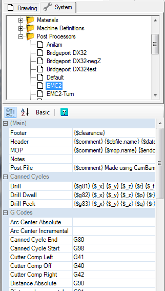 The format of generated gcode files can be controlled using post processor definitions. These definitions can be created, copied and modified within the Post Processors section of the System tab.