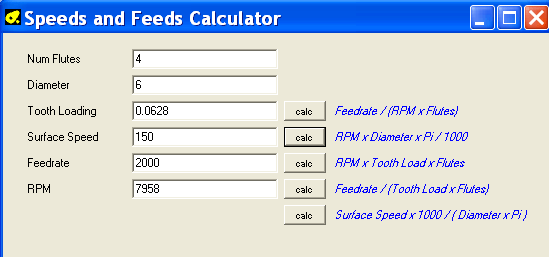 The speeds and feeds calculator is rather basic at the moment. It requires an understanding of the theory of the calculations involved. It will also require information from external references, such as tooling data sheets from cutter manufacturers, and machinist’s lookup tables.