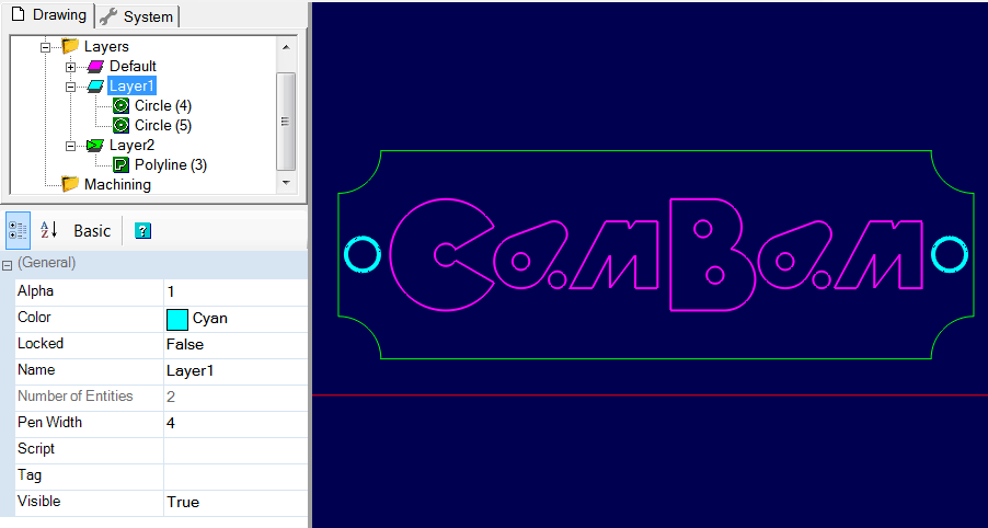An example template drawing: nameplate.cb, is provided. This template allows the creation of a nameplate with raised lettering, commonly used for locomotive name plates. This template contains all the drawing objects and machining operations required. The default text can be quickly changed by double clicking the text object in the drawing view.
