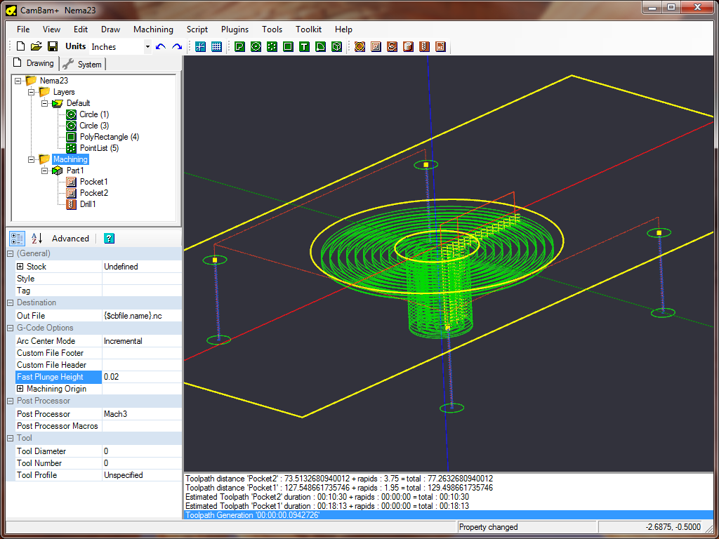 This sample project will demonstrate the general process involved in going from a new drawing to final gcode. The object is a mounting plate for a Nema 23 stepper motor and will include CAD, pockets and drilling machine operations.
