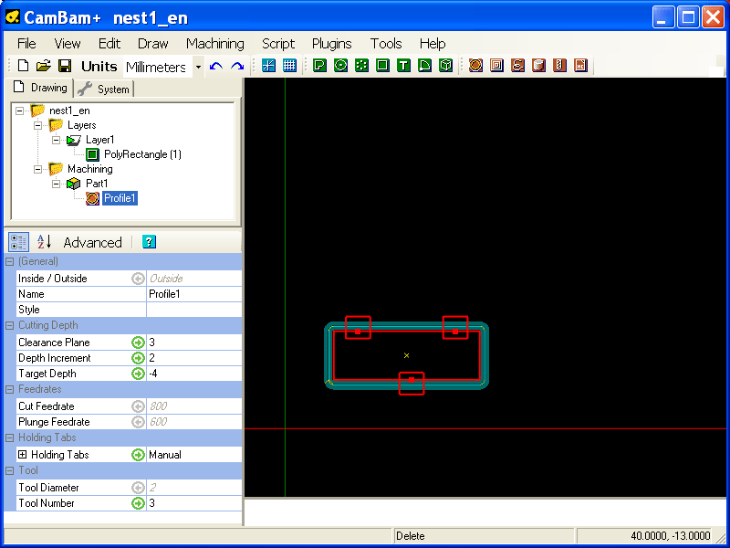 For this example, we will use a single operation; an external cut of a rectangle of 10 x 30 mm, with a tool of 2 mm diameter.