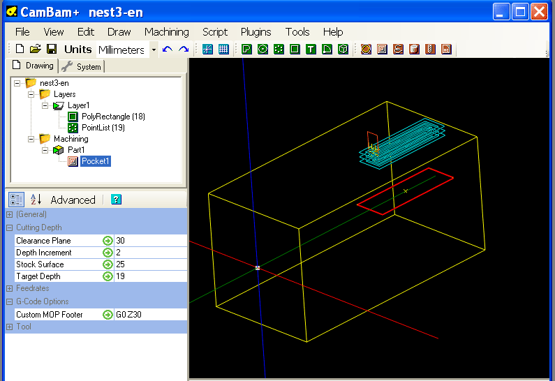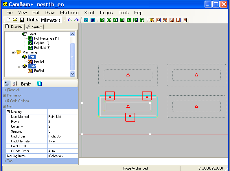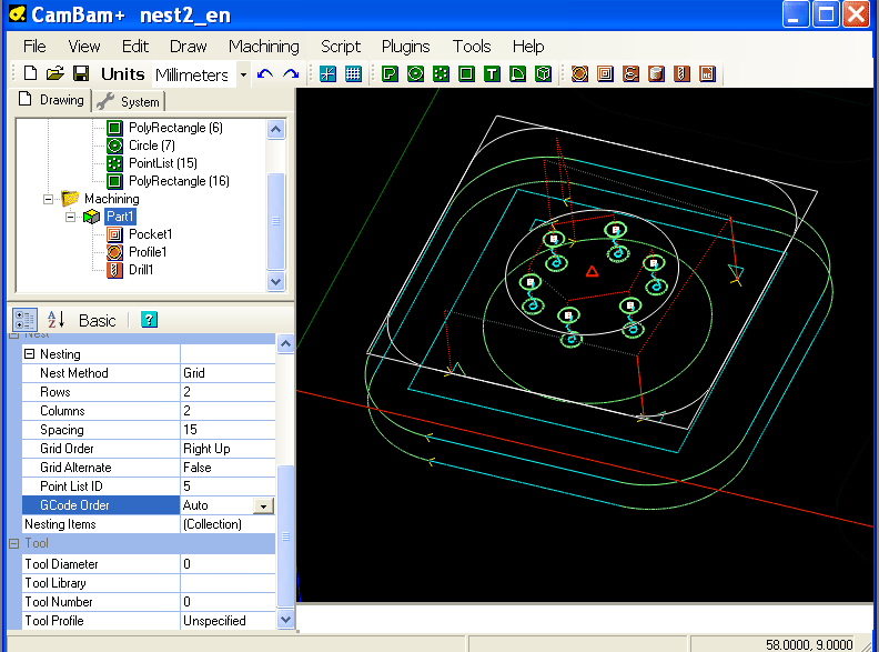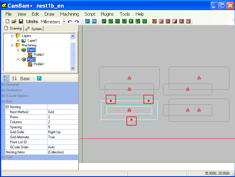CamBam’s nesting provides a method to repeat a series of machining operations at different positions on the machine table. In this way, it is possible to produce multiple copies of a workpiece from a single drawing and one set of machining operations.