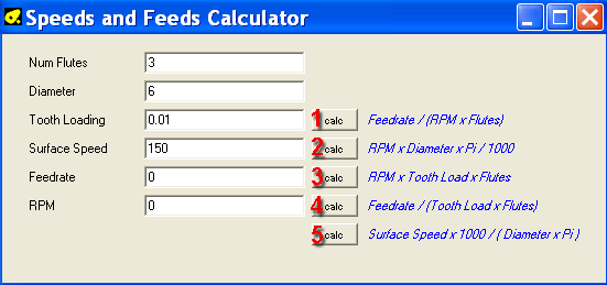 1) Clicking button 5, will calculate the spindle speed (RPM) from the surface speed and tool diameter.