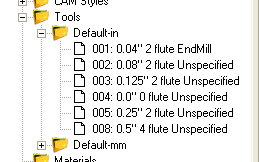 If no tool library is specified in the drawing, the default libraries will be searched for entries of this tool number. The default libraries are labeled ‘Default-in’ and ‘Default-mm’, where the units of the current drawing will be used to choose the correct library according to the ‘-in’ or ‘-mm’ suffix.