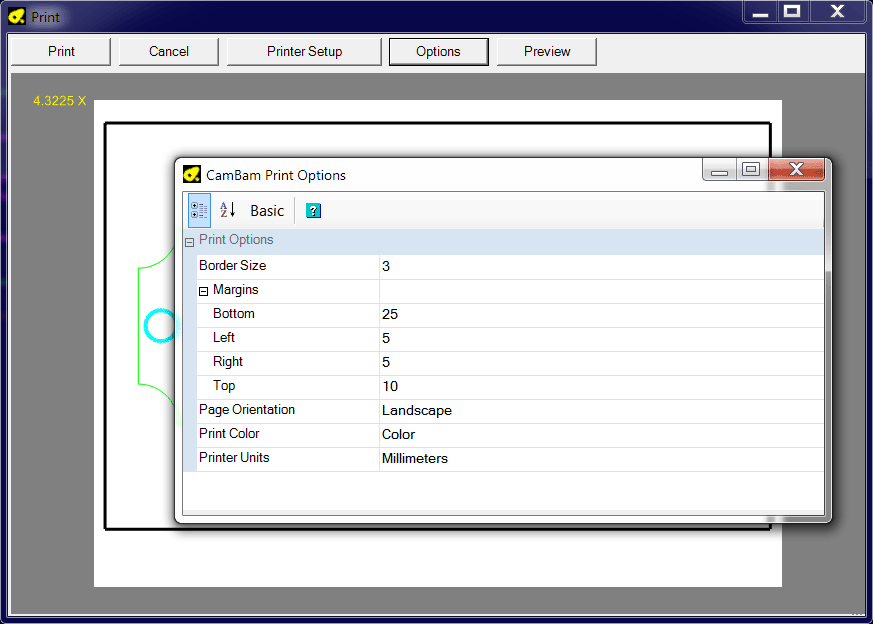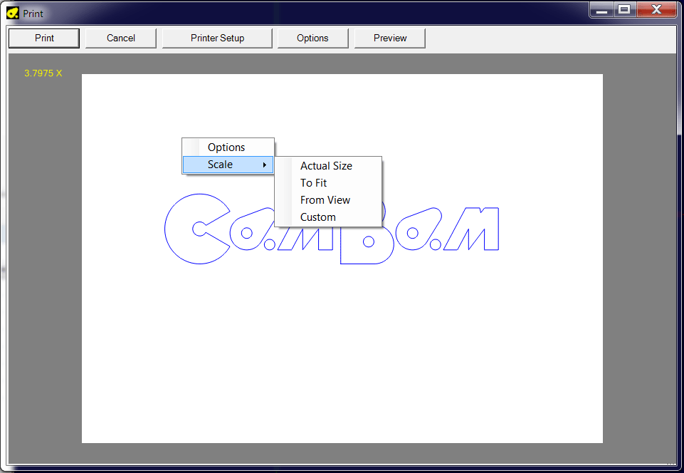 The print dialog window allows you to position the drawing on the sheet, change its zoom factor with the mouse or with a pop-up menu, and access printer settings and other options.