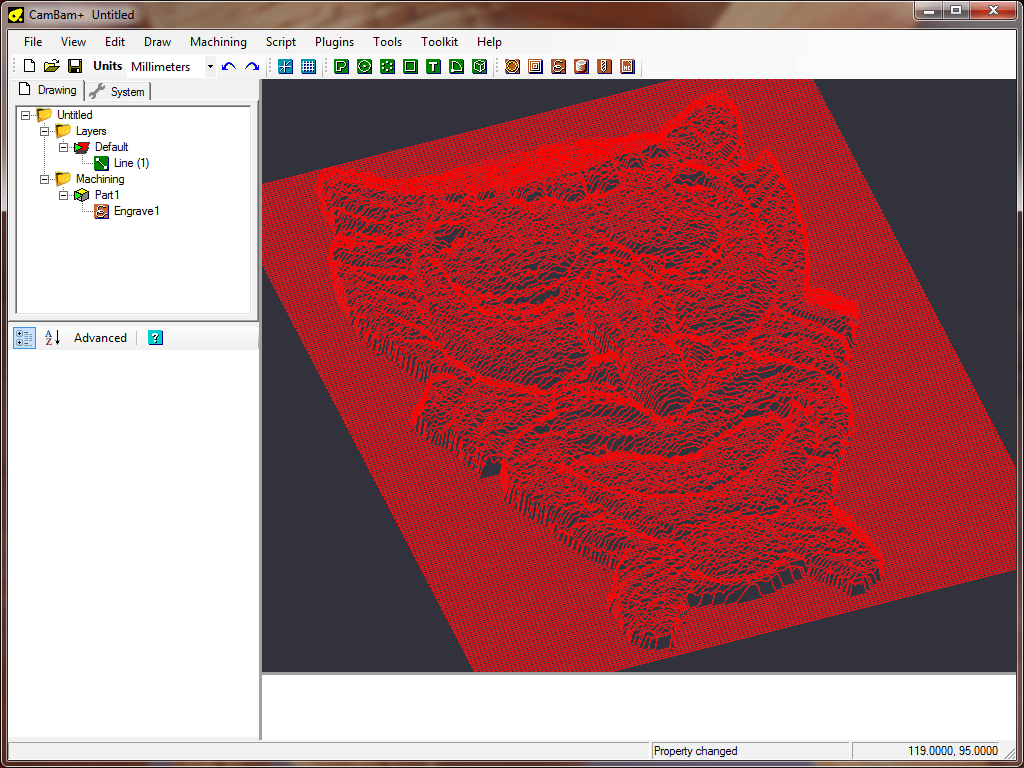 As well as generating a 3D Line object that contains the resulting heightmap, the plugin also creates an engraving machine operation linked to this line. An engraving operation is used as these are designed to ‘follow’ the associated geometry. In effect it is using the 3D line as a toolpath.