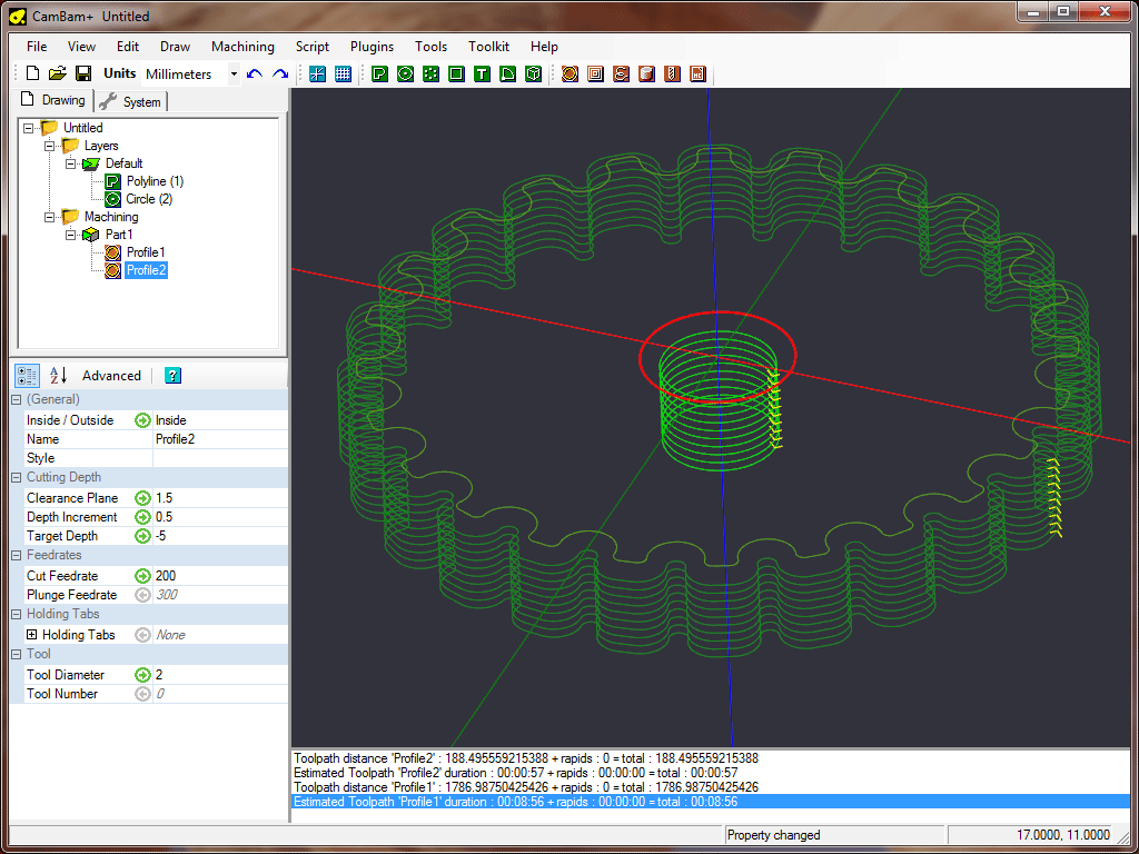 Generate the resulting toolpath for the profile; right click the drawing to bring up the drawing context menu, then select Machine - Generate Toolpaths.