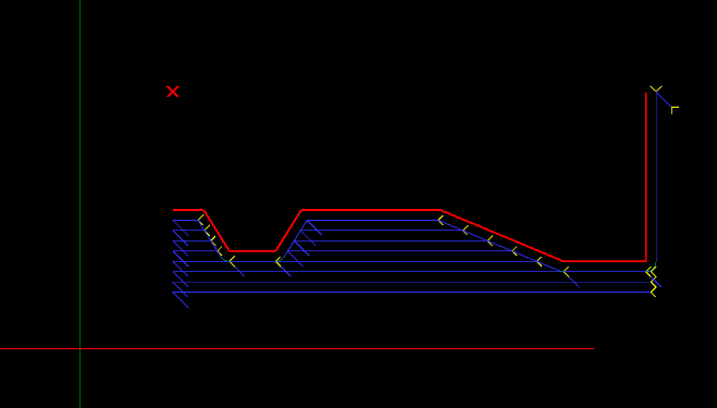 The same pattern drawn away from the origin, where the machining origin (red X) has been moved to indicate the lathes X=0, Z=0 point.
